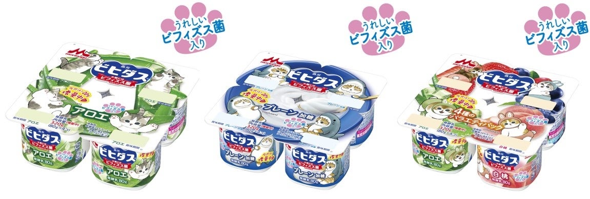 特別パッケージが公開されるタイプのコラボ。「ビヒダス ヨーグルト 4ポット」シリーズが増量されるキャンペーンにあたり、大人気キャラクター「mofusand」のにゃんこたちが表面にデザインされた。