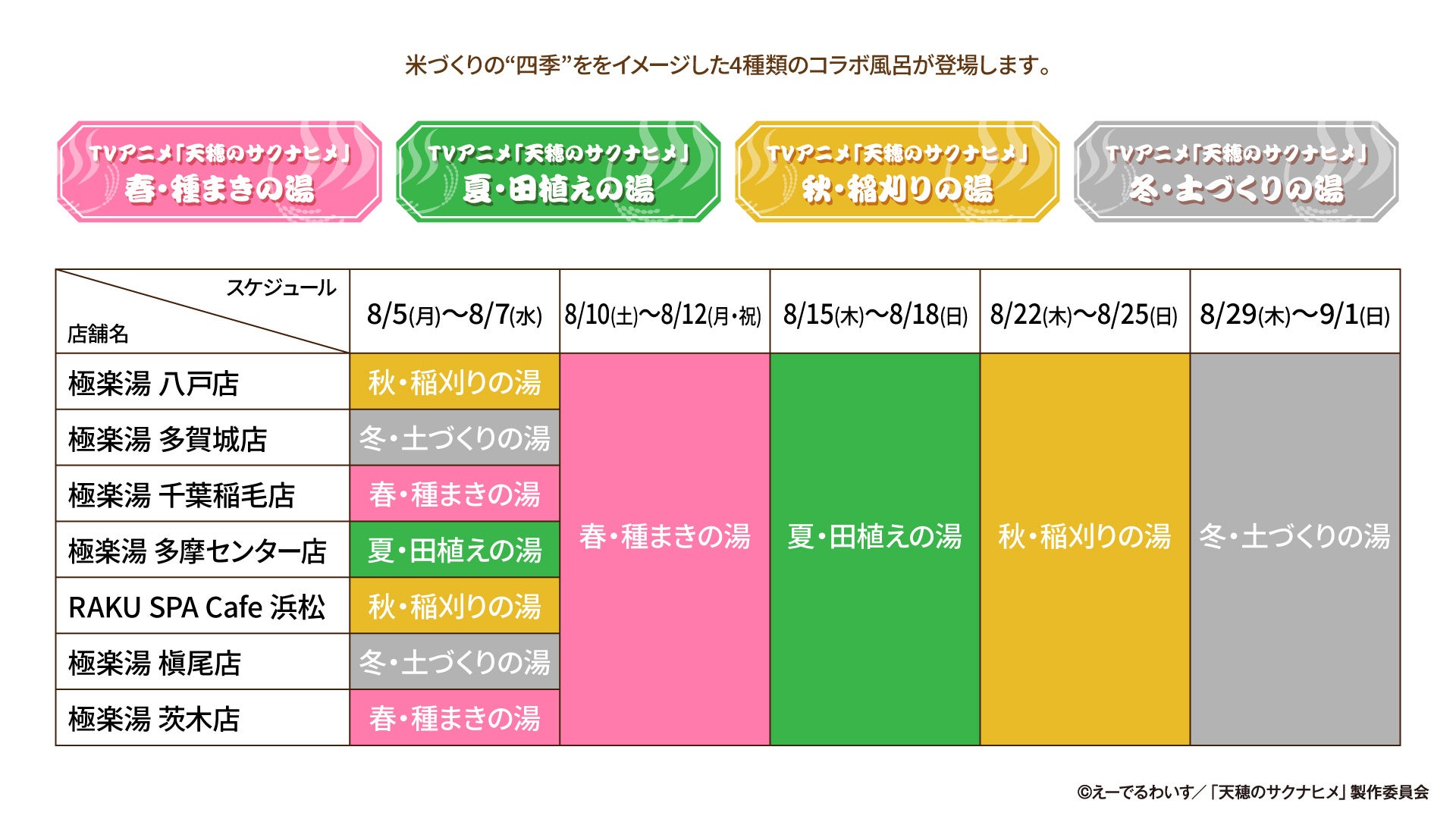 米づくりの“四季”をイメージした4種類のコラボ風呂が登場し、浴室には特別にデザインしたタペストリーを装飾します。各店舗の開催スケジュールはコラボHPをご確認ください。