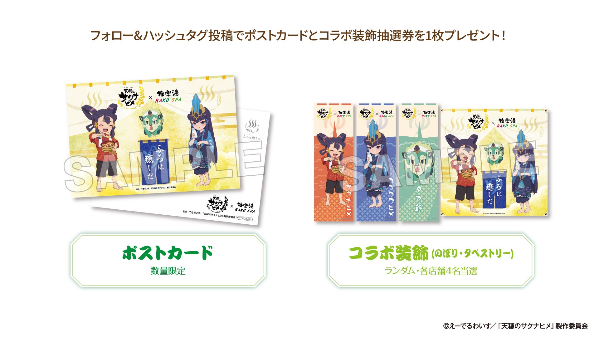 極楽湯/RAKU SPA(公式)Xをフォローし、ハッシュタグ「#ふろは癒しだ」をつけてコラボにまつわる内容を投稿し、店舗の受付にご提示いただいた方に、先着でコラボオリジナルデザインの数量限定ポストカードと、館内装飾に使用したのぼり・タペストリーが抽選で当たる抽選券をお渡しします。抽選し各店限定4名様にプレゼントいたします。