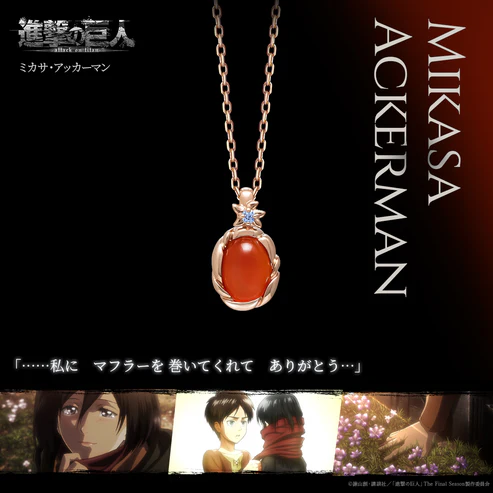 ミカサがマフラーを巻いてもらうシーンをモチーフにしています。「絆」「守護」「情熱」の石言葉を持つレッドアゲートで、マフラーのカラーをイメージ。布のやわらかさを感じる石枠にセッティングし、全体でマフラーを巻かれているミカサを表しました。バチカン部分は花の石枠にブルーのキュービックジルコニアを留め、そのシーンで足元に咲いていた花を表現しています。普段クールなミカサの、時折見せる可愛らしさを感じるようなデザインです。