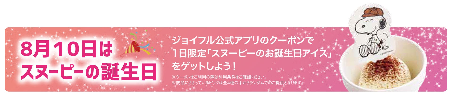 8月10日はスヌーピーのバースデー!ジョイフル公式アプリで、1日限定「スヌーピーのお誕生日アイス」クーポンをプレゼント!