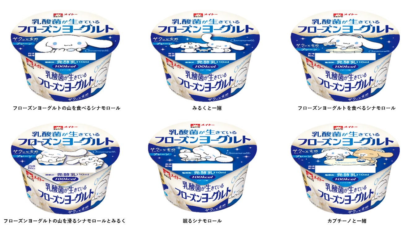 今回のコラボパッケージのために書き下ろされたパッケージデザインには、シナモロールが様々な場面でフローズンヨーグルトを楽しんでいる様子が描き出されています。お友達のカプチーノ、みるくと一緒にフローズンヨーグルトを食べておしゃべりを楽しんだり、食べながらついついうたた寝をしてしまったり、フローズンヨーグルトの山を滑ったり⁉️表情豊かなシナモロールたちの可愛さは必見です。