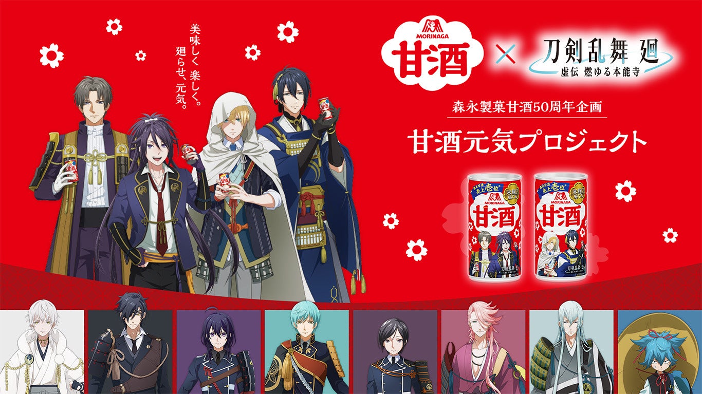 「森永甘酒缶」は今年50周年を迎えました。長く愛されてきた「森永甘酒」を今後も多くの皆様に楽しんでいただくため、甘酒を愛飲する不動行光をはじめとした刀剣男士たちが登場するアニメ「刀剣乱舞 廻-虚伝 燃ゆる本能寺-」とのコラボレーションが実現いたしました。作中に登場する刀剣男士たちとタッグを組み、「森永製菓甘酒缶50周年企画 甘酒元気プロジェクト」を実施します。