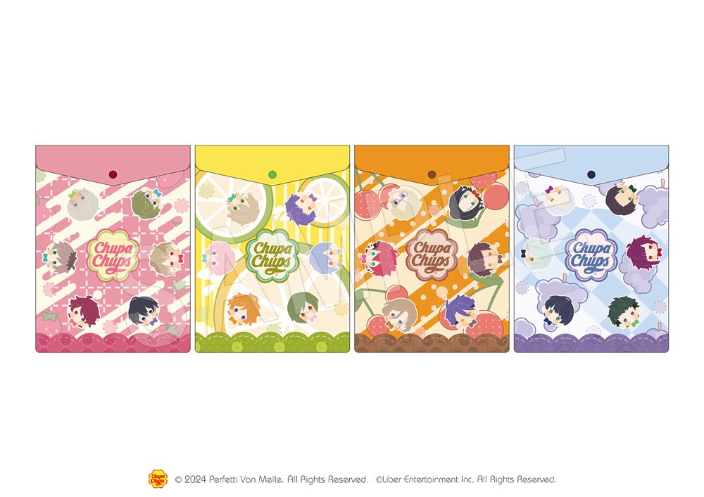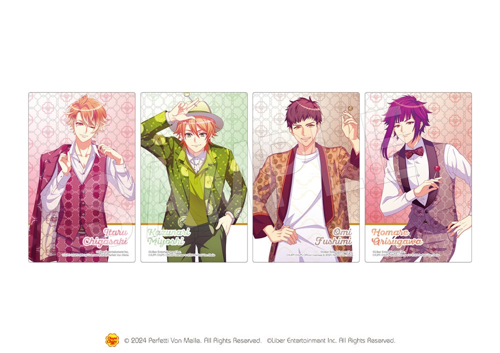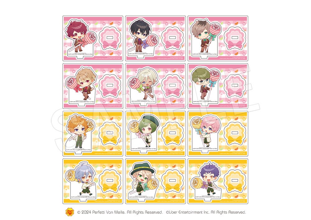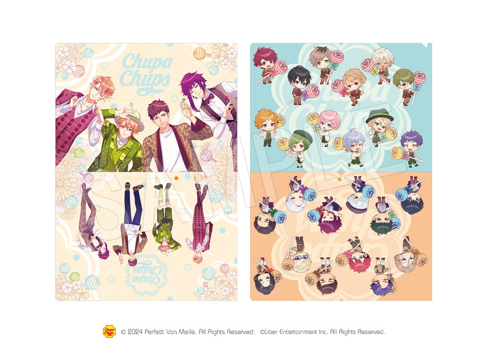 チュッパチャプス要素を随所に盛り込んだ衣装を身に纏う至、一成、臣、誉4人の新規描き下ろしイラストを使用した「アクリルスタンド」や、ミニキャライラストを使用した「クリアファイルセット」など様々な新作グッズの販売や抽選会を実施!