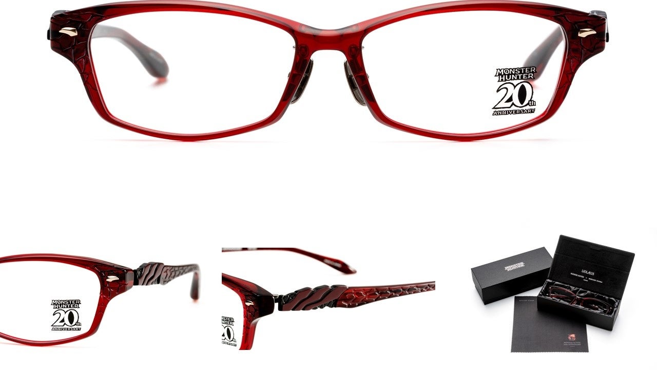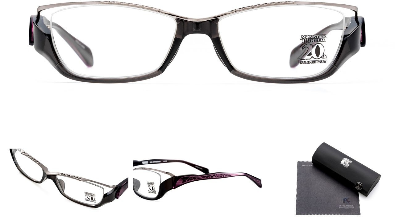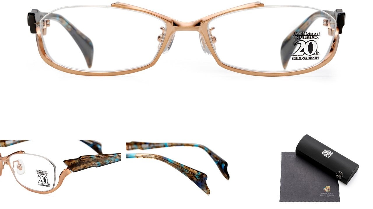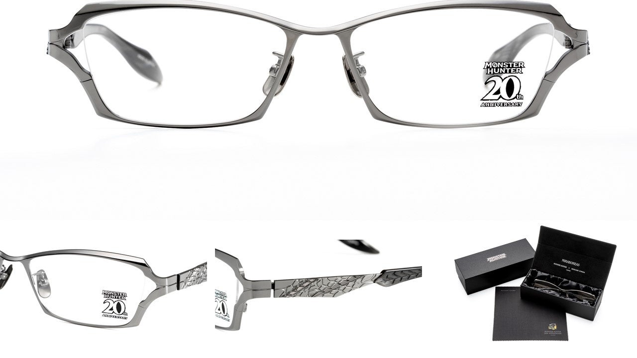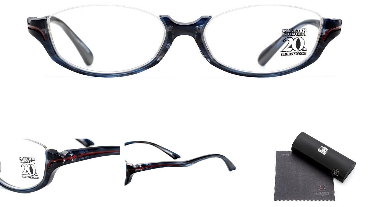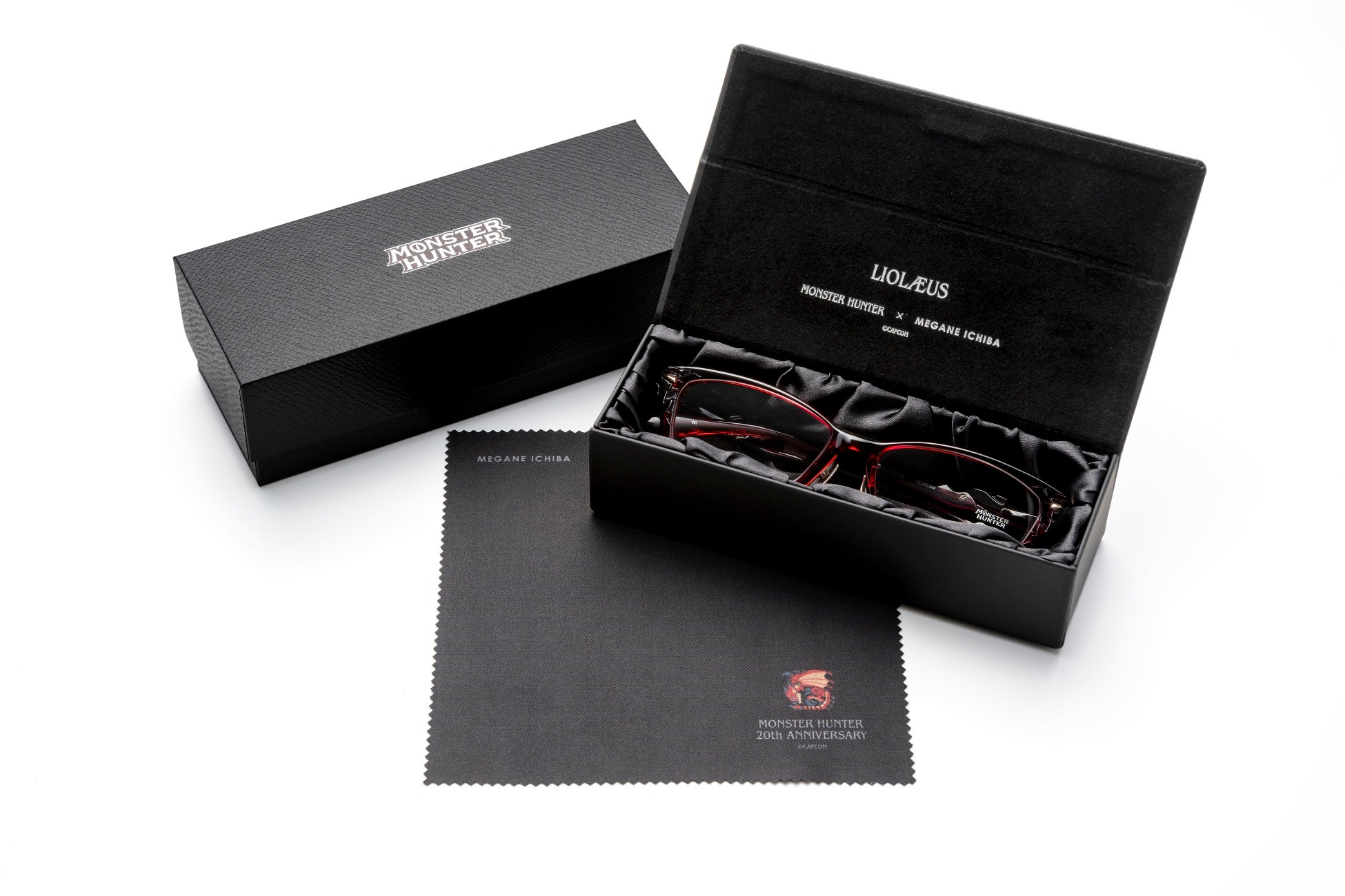 モデルごとに、20周年ロゴやモンスターアイコンをあしらった専用のメガネケースと、モンスターアイコンを印刷したメガネ拭きが付属しており、「モンスターハンター」の世界観を存分に感じることが出来るセット内容です。
