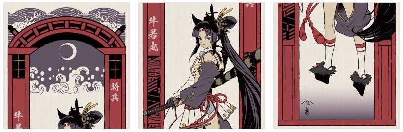 牛若丸を語る上で有名な場面は五条大橋(現在の「松原橋」と云われている)での弁慶との一騎打ち、そして荒武者平教経と船上決戦で見せた“義経の八艘飛び”。ゲームでも表現されているそれらの要素をモチーフとして背景にて表現し、牛若丸の凛々しい姿を描いています。