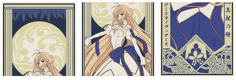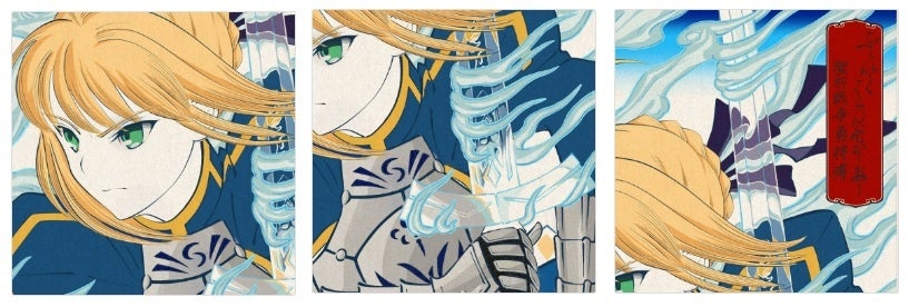 セイバー/アルトリア・ペンドラゴンの姿を江戸の庶民の間でも人気を博した役者絵(武者絵)の大首絵としてダイナミックかつ繊細に表現しました。宝具・風王結界(インビジブル・エア)を纏い透明化したエクスカリバー(約束された勝利の剣)も浮世絵らしい風合いで描き上げています。