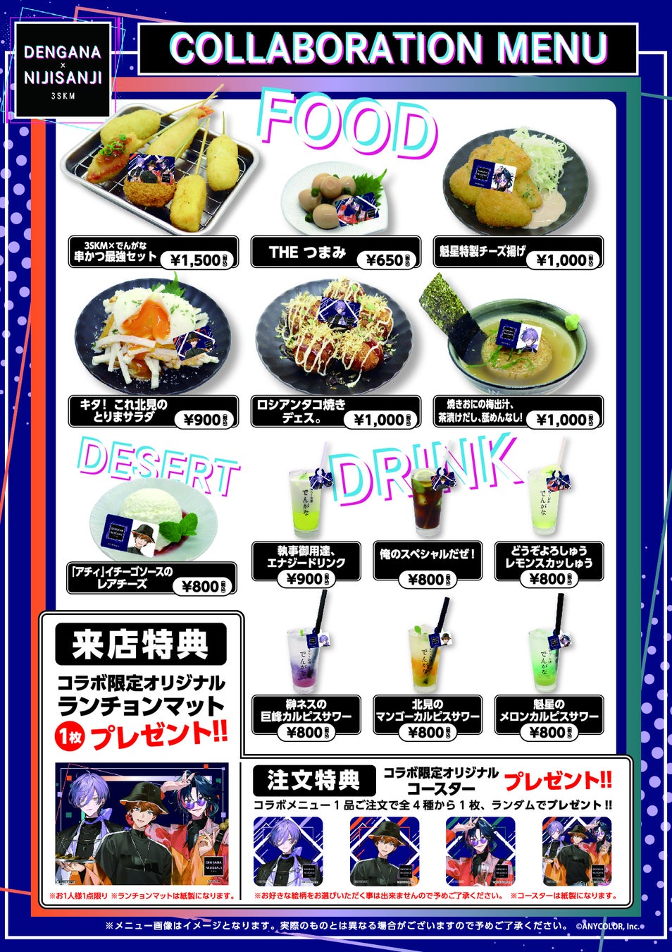 株式会社フォーシーズが運営する串かつ居酒屋『串かつ でんがな』とネオ居酒屋『串かつとお酒 でんがな』が、にじさんじ所属のVTuberユニット「3SKM(スリーエスケーエム)」とコラボしたメニューの提供や、コラボグッズの販売を実施します。