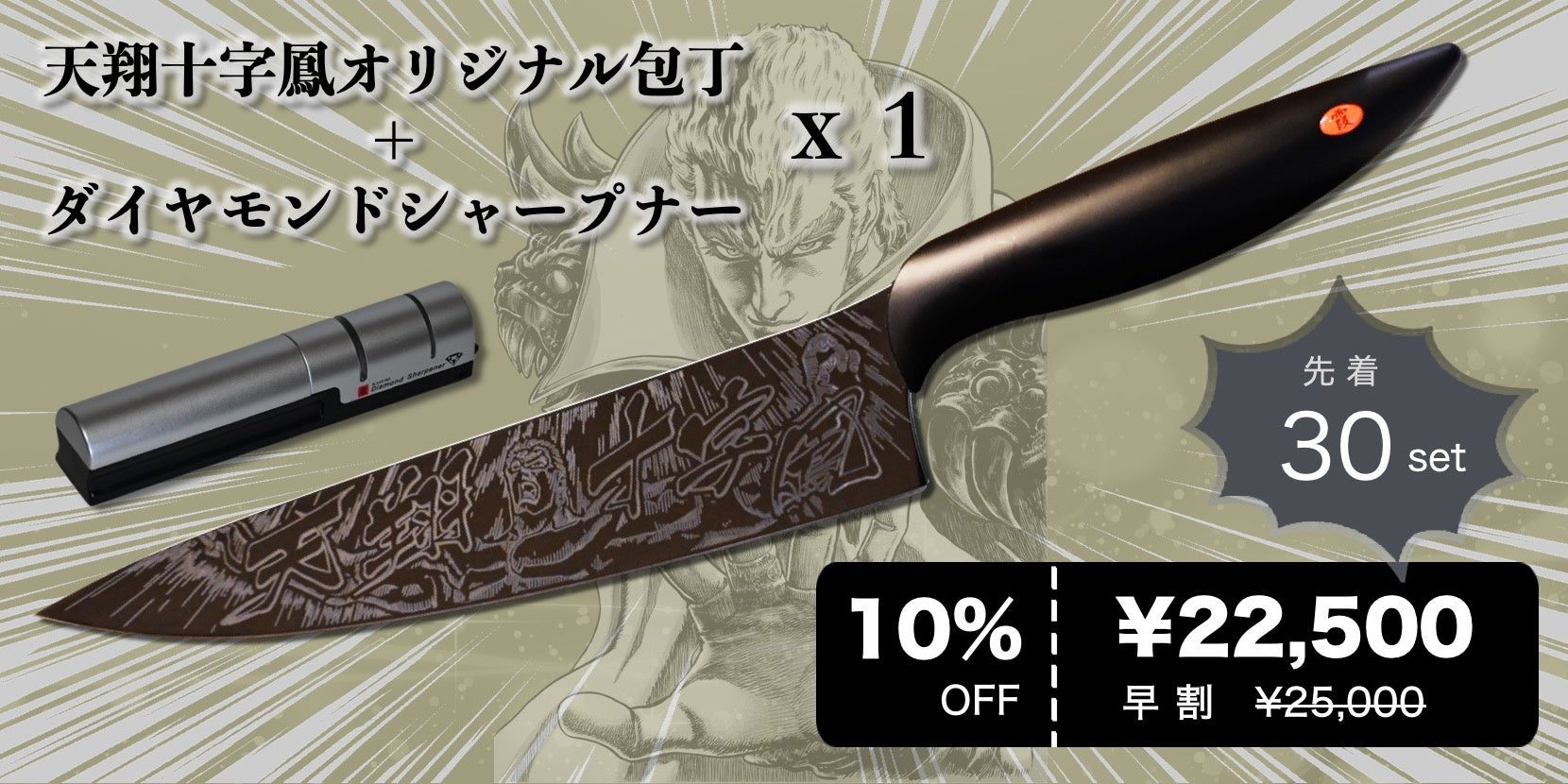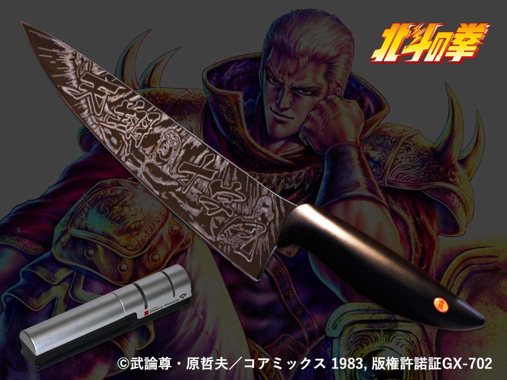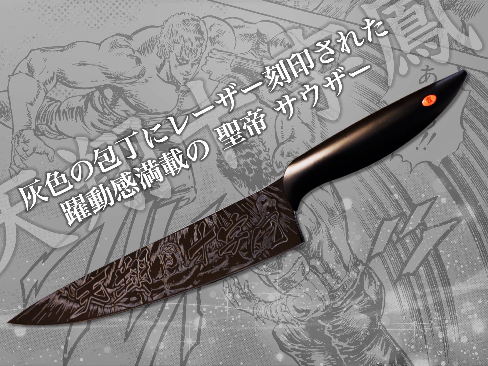 創業100年を超える職人技術を駆使した高い機能性を持つ全長34cm(刃渡り20cm)の万能剣型包丁に、北斗の拳の人気キャラクター『サウザー』をデザインしています。灰色の特殊なチタンコーティングを施した切れ味抜群の包丁は、「観ても使っても楽しい」遊び心満載の逸品です。