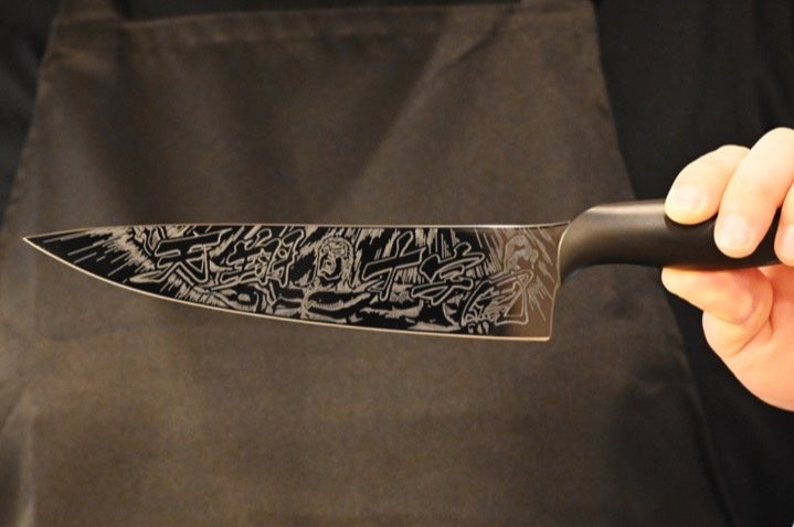 灰色の刀身に刻まれたサウザーのデザインは、高速レーザー技術を駆使して、1本あたり1時間近くの時間をかけることで、きめ細やかさ且つダイナミックさを表現しています。