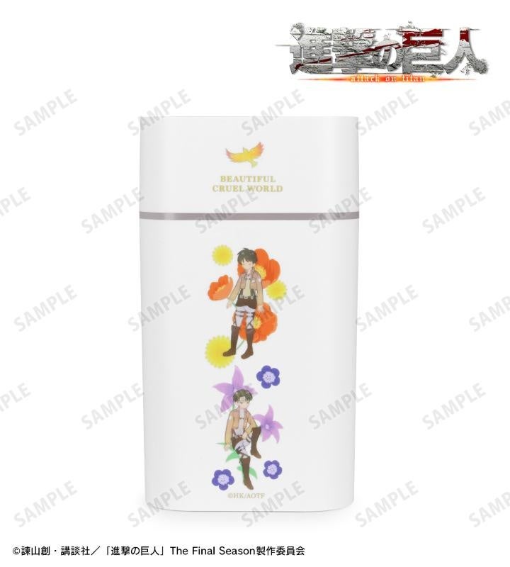 エレン、リヴァイのイラストをボタニカルデザインに落とし込み、繊細なタッチで新たに描き起こして卓上加湿器に仕上げました。