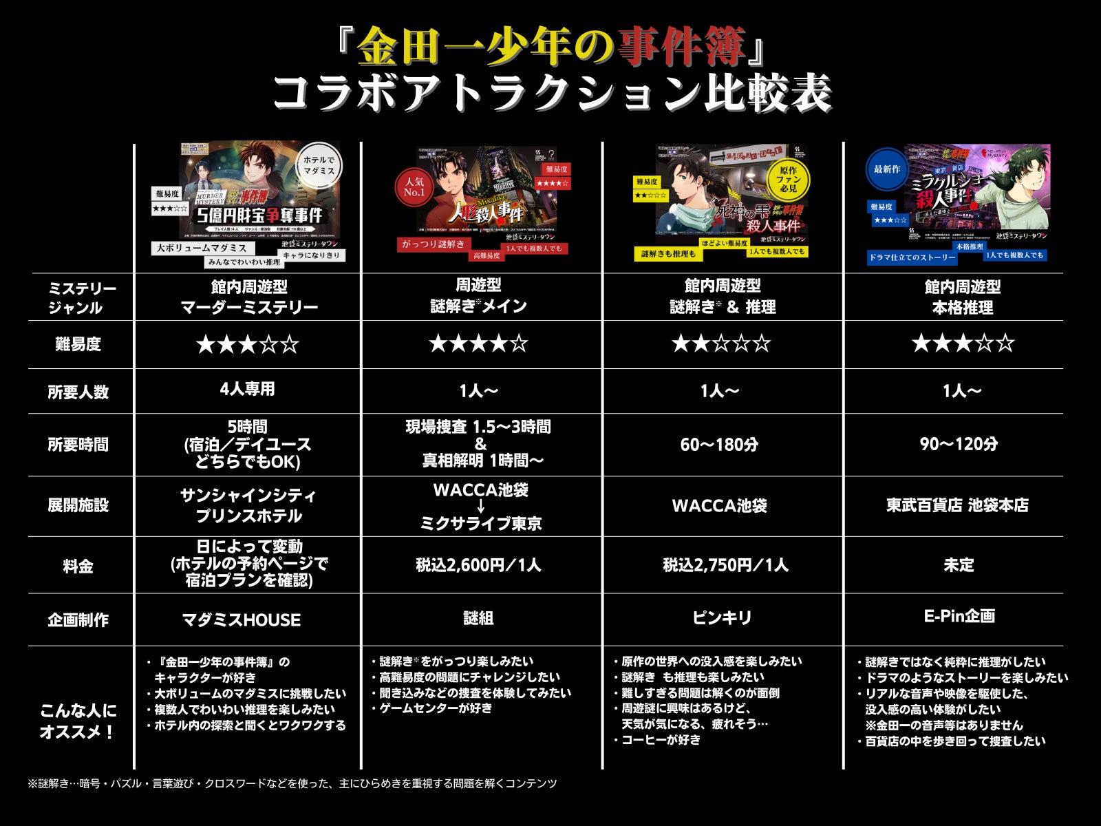池袋で展開する『金田一少年の事件簿』とのコラボアトラクションは全4作品に。マーダーミステリー、周遊型謎解き、本格推理など様々なジャンルをラインナップ