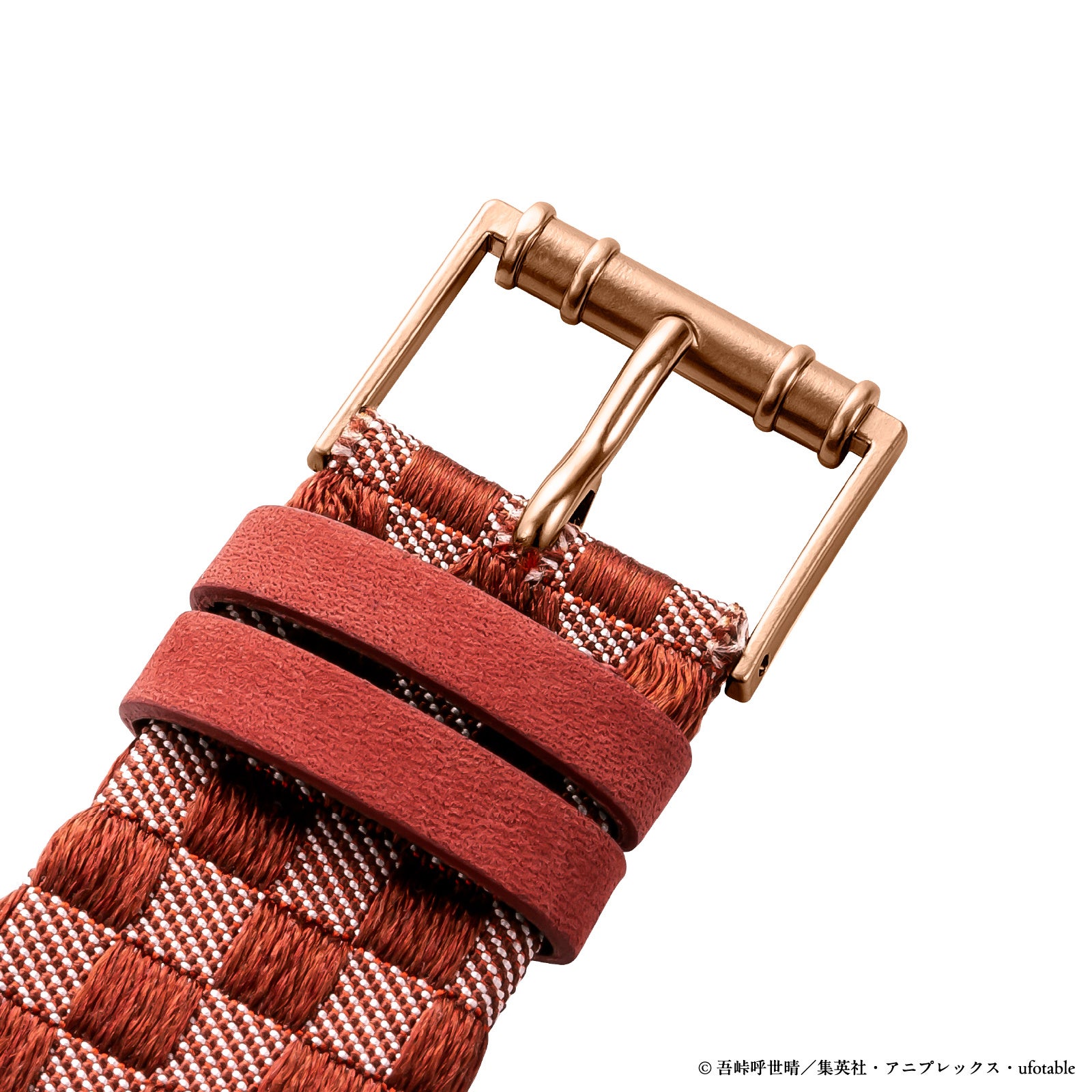 の協力のもと、竈門炭治郎の羽織をイメージした市松模様の西陣織を採用。下部分は落ち着いたグリーンのレザーストラップにポイントとして、竈門炭治郎が使用していた鐔を、さらにその下には煉獄杏寿郎より受け継いだ鐔を配置しています。ベルト裏には傷がデザインされています。
