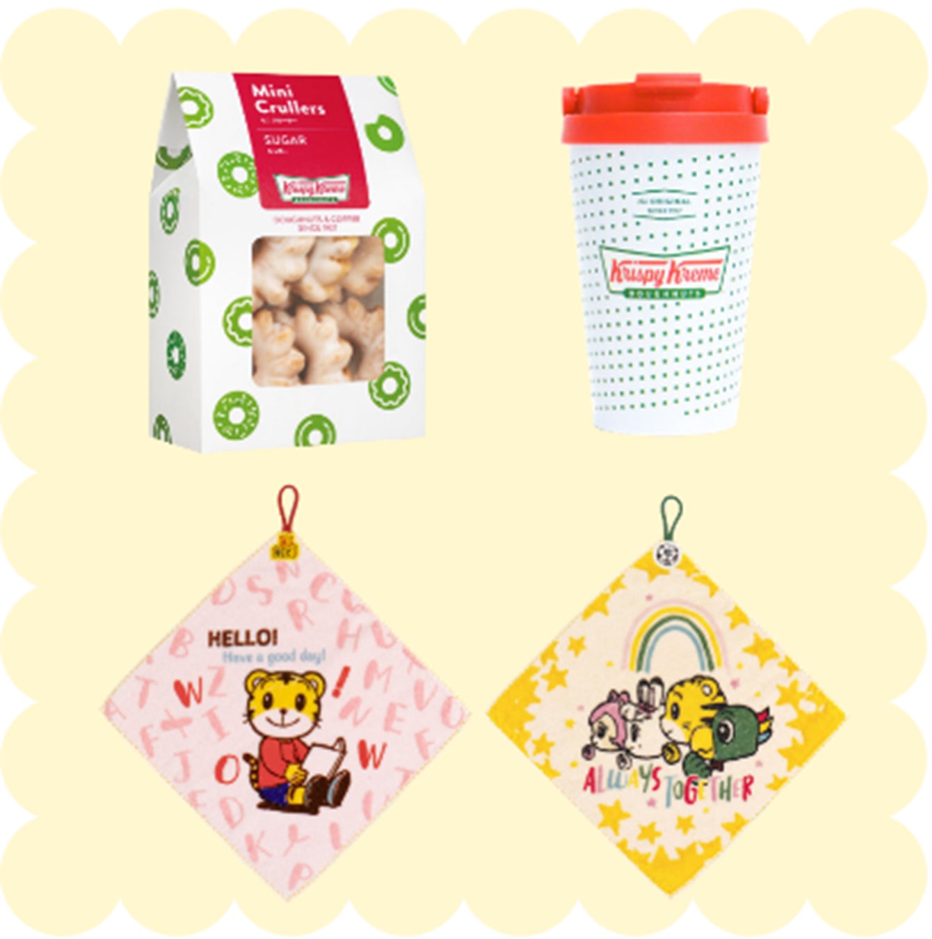 しまじろうコンサート会場内で撮影した写真を、InstagramもしくはX(旧Twitter)に指定のハッシュタグをつけて投稿いただいたかたの中から抽選で20名様に、クリスピー・クリーム・ドーナツのミニクルーラー(シュガー)・オリジナルタンブラー、しまじろうのループタオル(1種)のセットが当たります。