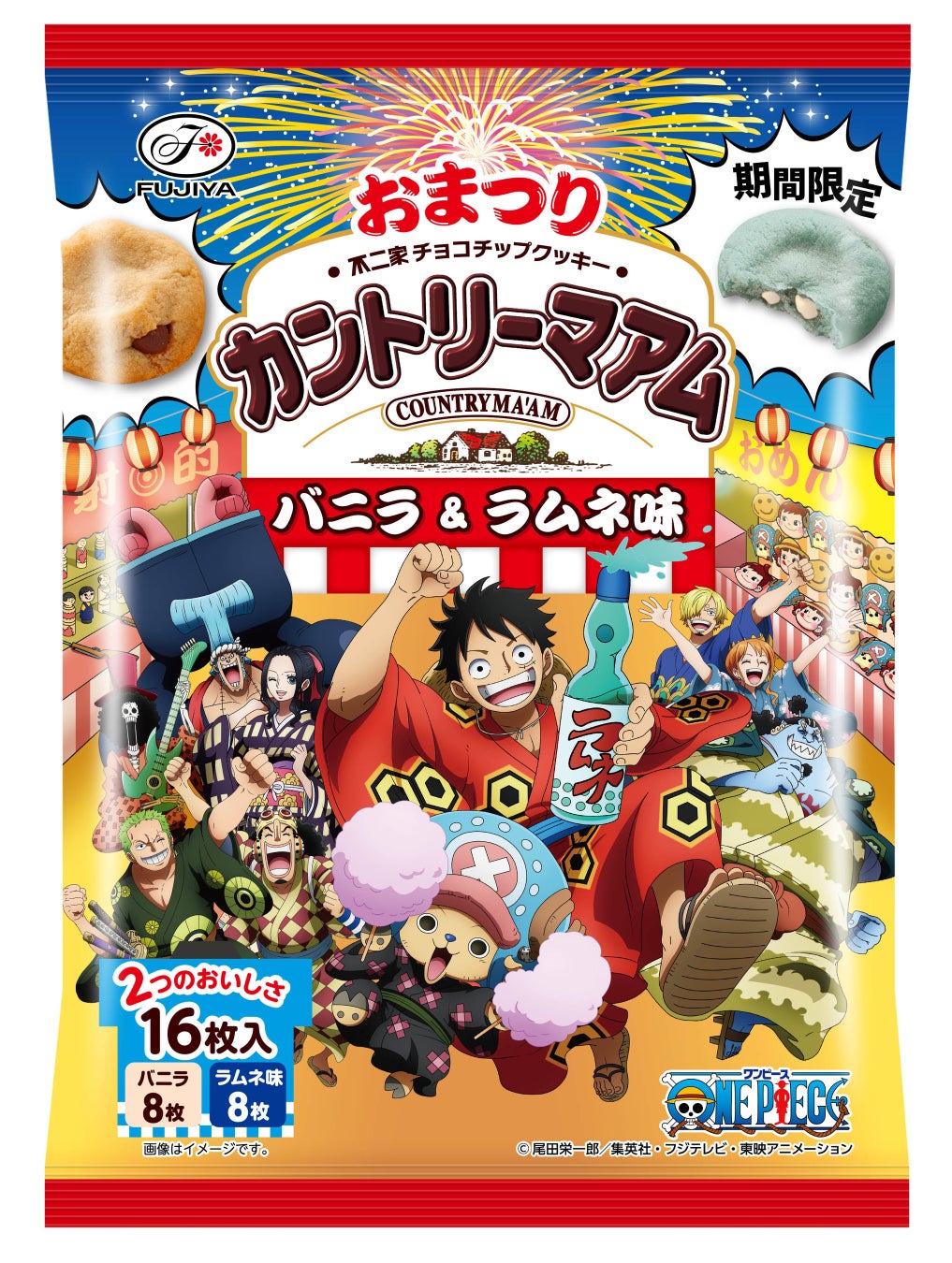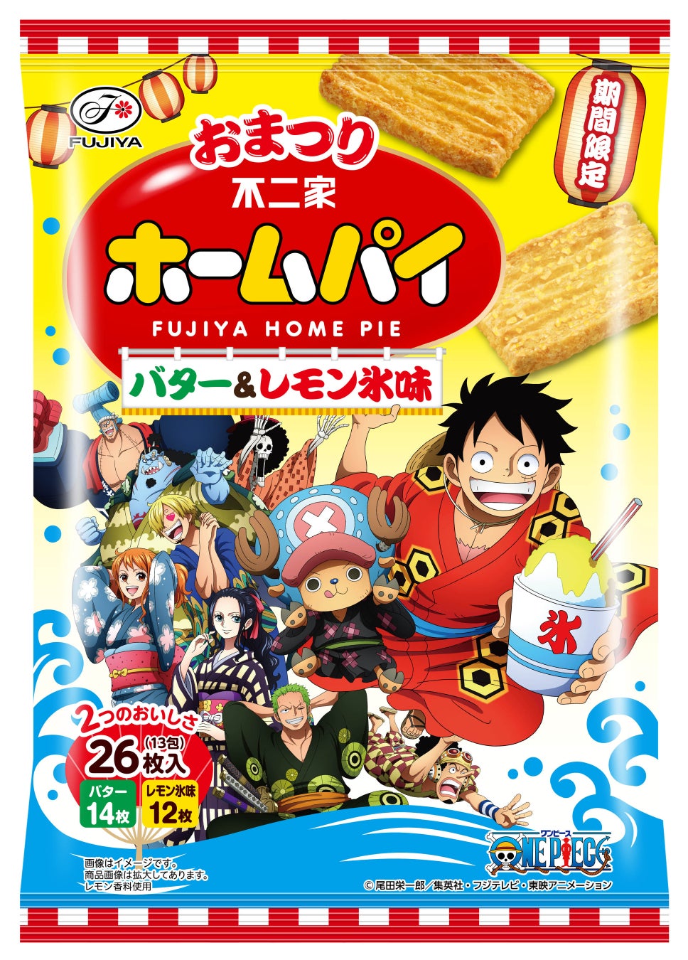 今回のコラボのためだけに特別に描き下ろされたイラストは、夏のおまつりをイメージし、麦わらの一味が浴衣を身にまとった楽しいデザインです。「カントリーマアム」、「ホームパイ」ともに、味わいもおまつり屋台をイメージした「ラムネ味」、「レモン氷味」と、夏しか出会えない期間限定商品です。