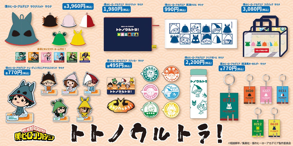 緑谷出久、爆豪勝己、麗日お茶子、轟焦凍、蛙吹梅雨、オールマイトをイメージしたサウナハットをはじめ、ステッカー、アクリルスタンドなどの雑貨もお見逃しなく!