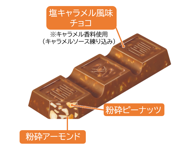塩キャラメル風味のチョコに粉砕したアーモンドとピーナッツを練り込み、ザクザク食感が楽しめます。