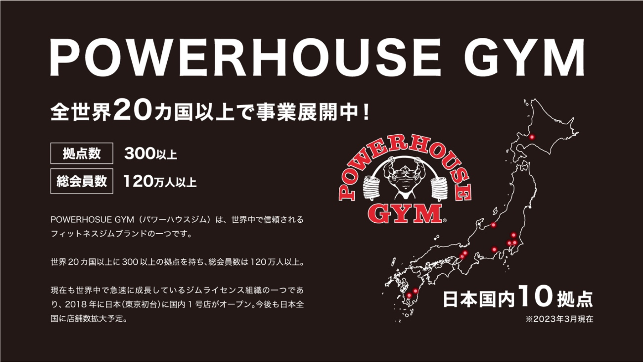 1974 年にアメリカミシガン州ハイランドパークにて誕⽣し、今年で創⽴ 50 周年を迎える POWERHOUSE GYM(パワーハウスジム)は、世界中で信頼されるフィットネスジムブラ ンドの⼀つです。世界20カ国以上に300以上の拠点を持ち、総会員数は120万⼈以上。現在も世界中で急速に成⻑しているジムライセンス組織の⼀つであり、2018年に⽇本(東京 初台)に国内1号店がオープン。2024年3⽉現在で10店舗を展開。今後も⽇本全国に店 舗を拡⼤していきます。