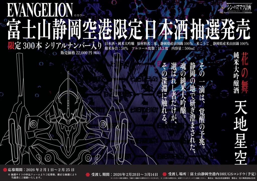 株式会社近藤薬局は、地域連携プロジェクト「シン・ハママツ計画2025」の展開に合わせ、富士山静岡空港限定企画として、『EVANGELION』と連携した純米大吟醸「天地星空」を抽選販売します。