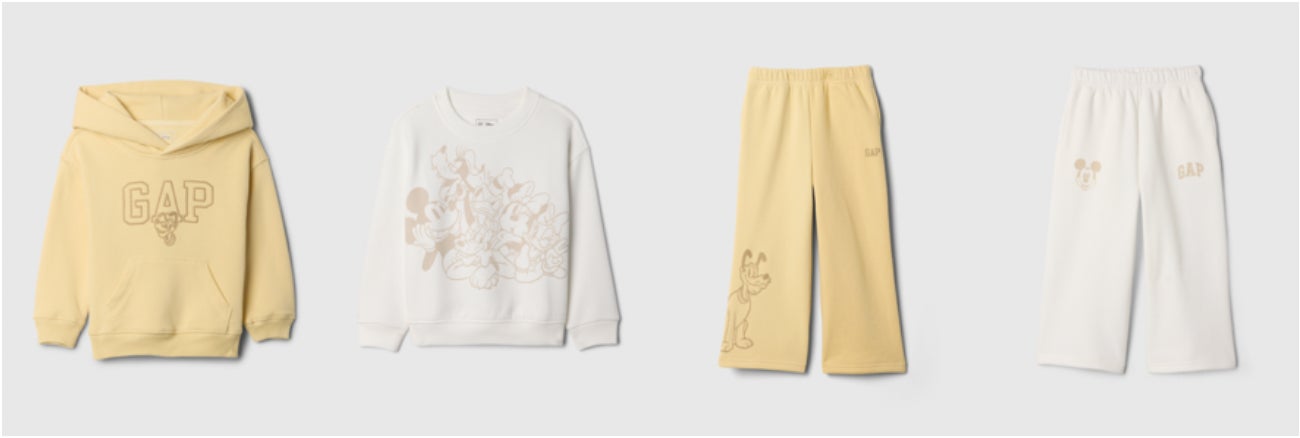 左から)Gap × ディズニー ヴィンテージソフト キャラクター パーカー ¥5,990、Gap × ディズニー ヴィンテージソフト グラフィック スウェット・トレーナー ¥4,990、Gap × ディズニー ヴィンテージソフト キャラクター スウェットパンツ ¥3,990、Gap × ディズニー ヴィンテージソフト キャラクター スウェットパンツ ¥3,990