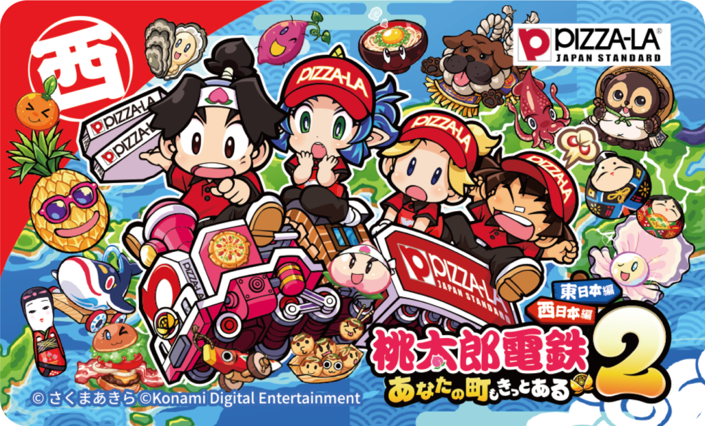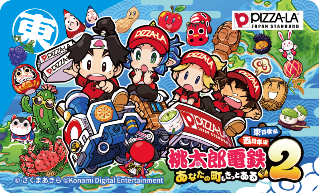 担当者:特製ICカードステッカーです。特製ピザーラお届け号の電車に乗った、描き下ろしイラストになっています!ピザを買うと、2種(東か西)の内、1枚がついてきます。さらに、ピザを食べて応募するプレゼントキャンペーンも実施。富士急ハイランド様にもご協力いただき、桃鉄賞・トンデミーナ賞・ピザーラ賞と3つをご用意しております。