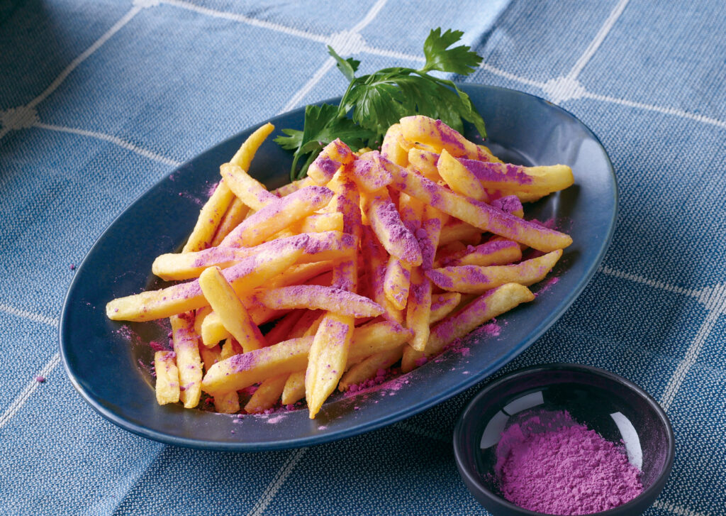 担当者:サイドメニューでは、今回の企画専用に開発したフレンチフライのフレーバーもキングボンビー色に。見た目は紫色ですが、食べるとおいしいコンソメバター味というギャップの楽しさをお届けしています。