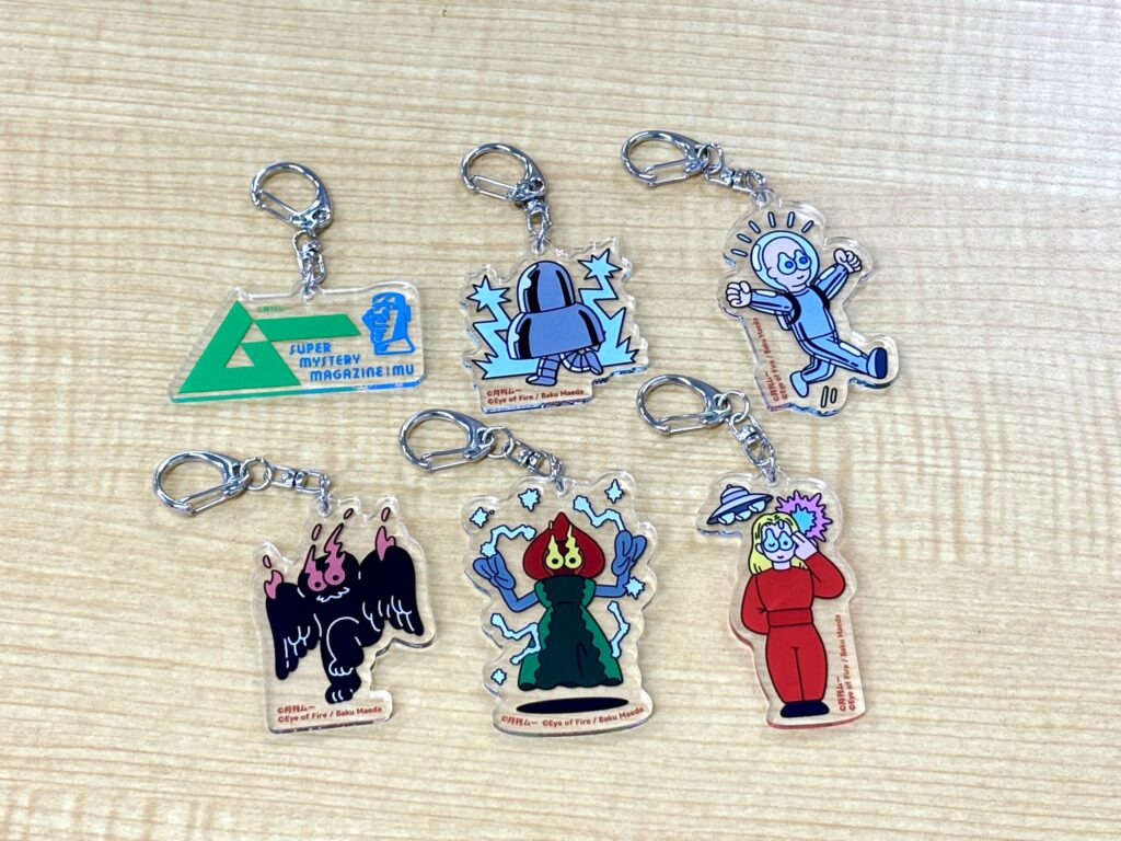 UMA&エイリアンたちがアクリルキーホルダーに!「スキンヘッドエイリアン」「フラットウッズ‧ モンスター」「⾦星⼈オーソン」「空⾶ぶモスマン」「メタルロボットエイリアン」に、ファミマカラーの『ムー』ロゴを加えた6種から選べます。