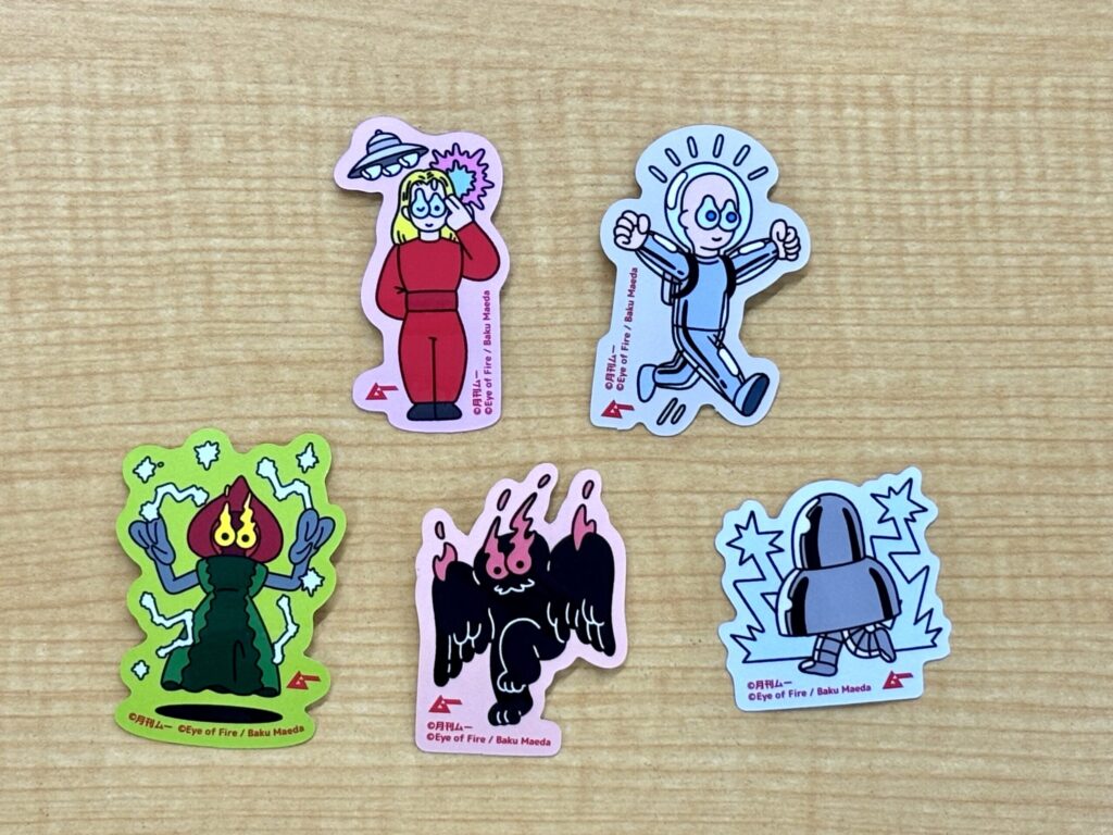 UMA&エイリアンたちが普段使いにぴったりのステッカーに!「スキンヘッドエイリアン」「フラットウッズ‧ モンスター」「⾦星⼈オーソン」「空⾶ぶモスマン」「メタルロボットエイリアン」の5種から選べます。UMA&エイリアンのステッカーに加え、『ムー』ロゴのステッカーが必ずついてきます。
