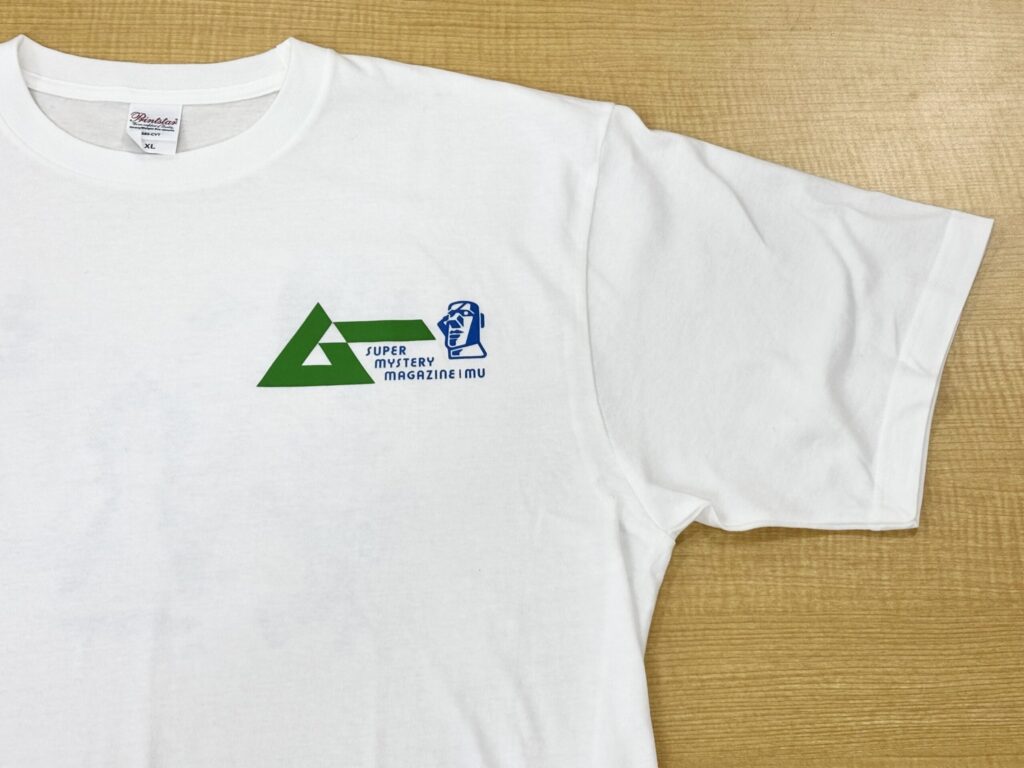 『⽉刊ムー』で⼤⼈気のビッグTシャツから『ムー』のロゴがファミマカラーで登場。胸元のロゴに加え、背⾯にはUMA×宇宙⼈が集合しています。