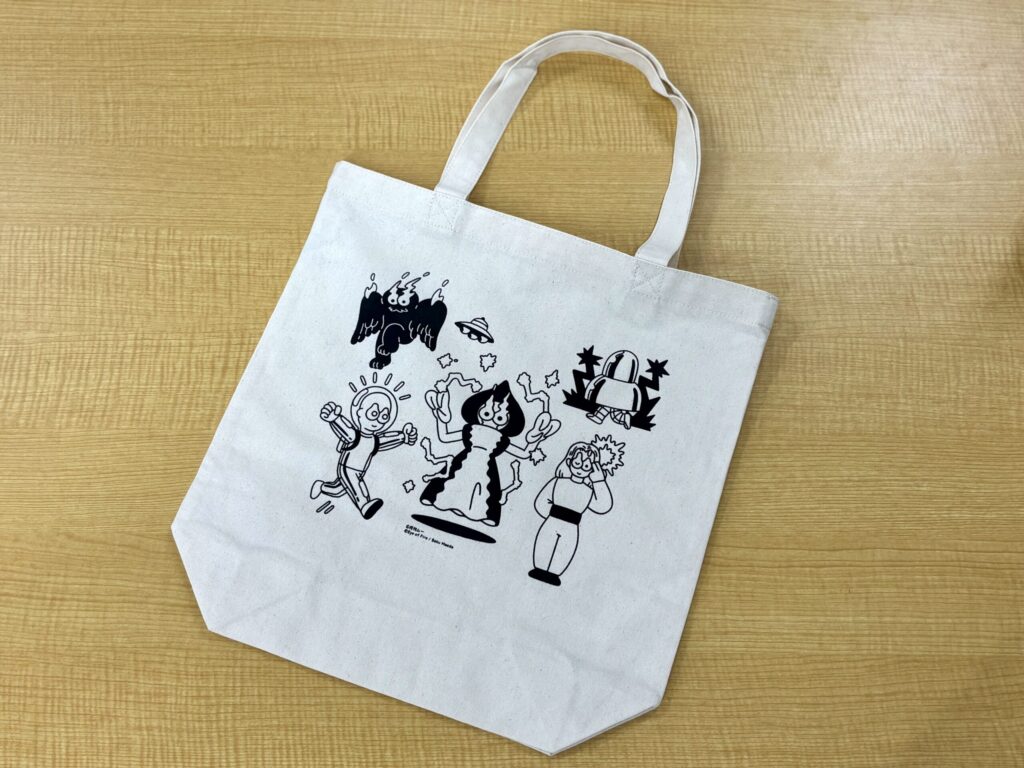 表にはファミマカラーのロゴ、裏にはUMA×宇宙⼈があしらわれた普段使いしやすいトートバッグです。