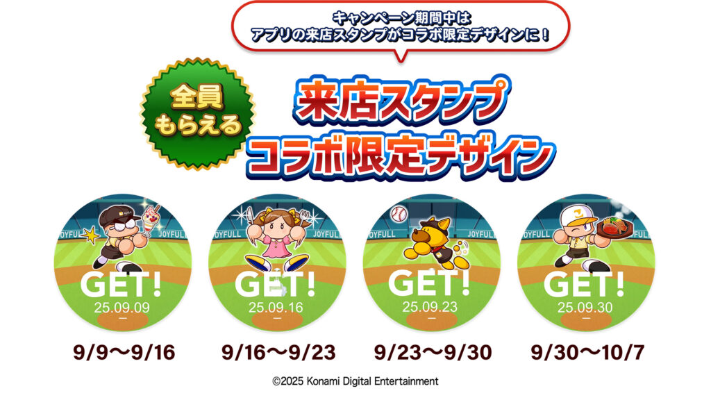 キャンペーン期間中、ジョイフル公式アプリの来店スタンプが「パワプロ」コラボ限定デザインとなっています。デザインは全4種類。