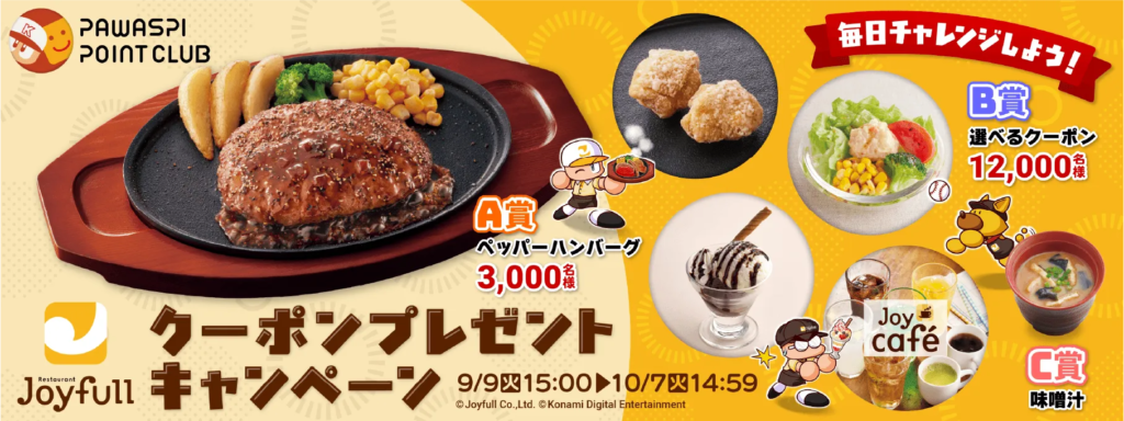 さらに、「パワスピ・ポイントクラブ」との連動企画では、抽選でジョイフルの無料クーポンが当たる企画もあります。