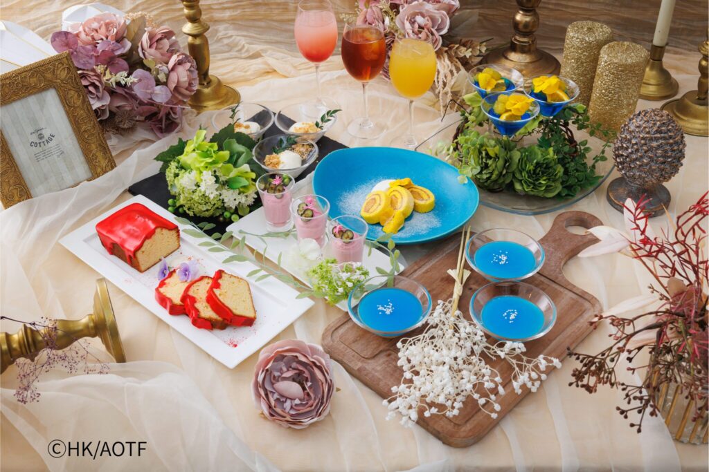 担当者:メインキャラである『エレン』『リヴァイ』『エルヴィン』のオリジナル録り下ろしボイスです 。会場内でのみ流れる音声なので、ぜひ楽しみにしてほしいです!そのほかにも、人気キャラクターがミニキャラとなった描き起こしイラスト入りのお食事会場内フォトスポット、シーンセレクションPV上映など、喜んでいただける企画が目白押しです。
