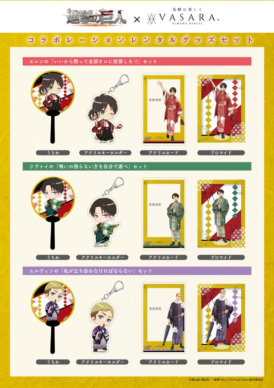 『着物レンタルVASARA』を全国に展開する株式会社バサラホールディングスが、TVアニメ『進撃の巨人』とのコラボレーションキャンペーン『Attack on KIMONO~その日人類は思い出した 着物で街を歩く喜びを~』を実施します。