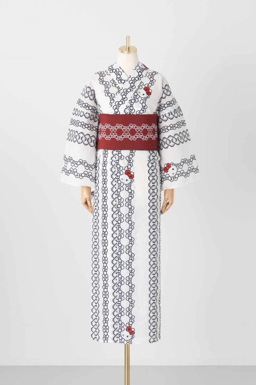 爽やかな白地に紺色の柄が涼しげな印象のゆかたは、こちらを覗くキティちゃんとりぼんの赤が着姿のアクセントになるデザイン。おそろい柄の半巾帯と合わせてお楽しみください。
