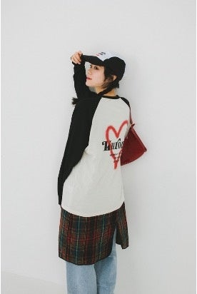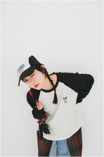 トレンドのスプレーハートモチーフが映えるラグランロンT。フロントはnemneオリジナルロゴとマイメロディ・クロミのワンポイント刺繍入りです。ルーズになり過ぎないサイズ感で幅広いコーディネートが楽しめます。