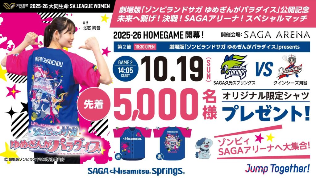 10月24日(金)「劇場版ゾンビランドサガ ゆめぎんがパラダイス」公開前に本作にも出てくるSAGAアリーナでバレーボールの試合をお楽しみください。